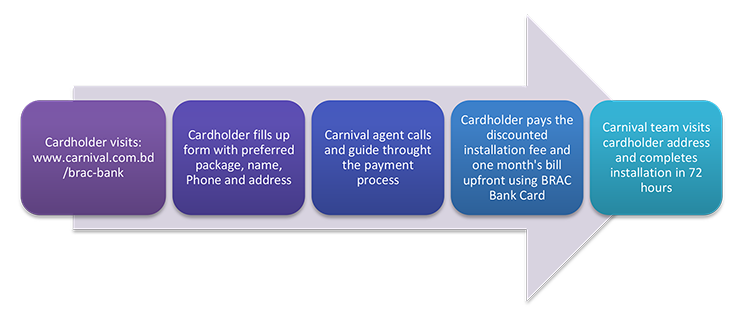 BRAC Bank Cardholders should visit www.carnival.com.bd/brac-bank to fill up a form with these fields - a. preferred package; b. name; c. phone; and d, address. A representative from Carnival will communicate and guide throughout payment the process. Then Carnival team will reach customer’s desired address and complete installation in 72 hours.