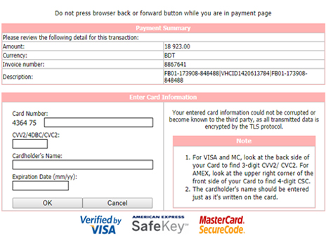 For payments using VISA / Martercard credit or debit cards, an additional 2% Convenience Fee will be charged on top of your invoice amount. Ex: Invoice amount BDT 1,000 + 2% Bank fee = BDT 1,020 total payable amount.