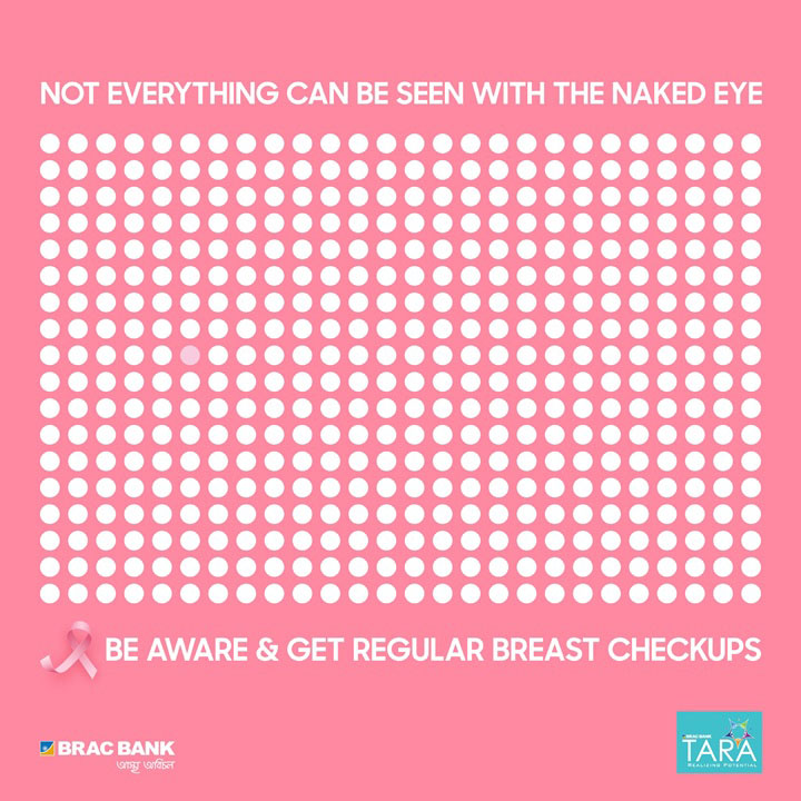 October is Breast Cancer Awareness month and BRAC Bank would like to draw attention to the risks associated with breast cancer. Every year in Bangladesh 12,764 women are affected by breast cancer, leading to untimely deaths. When abnormal cells grow rapidly and begin to invade surrounding tissues of the breast, they form cancerous tumors. These invisible to the eye lumps/tumors pose a serious risk and can spread, causing risks of breast cancer.