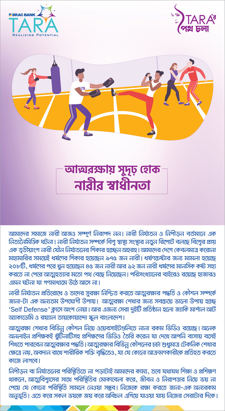 এ যুগের মেয়েরা ঘরকুনো সমাজের গণ্ডি পেরিয়ে এগিয়ে গেছে অনেক দূর। পড়াশোনা, চাকরি, সংসার, ব্যবসা বিভিন্ন প্রয়োজনে তারা সকাল থেকে রাত পর্যন্ত থাকছে ঘরের বাইরে। একা একা চলাফেরা করতে তারা অভ্যস্ত। তবে সোশ্যাল মিডিয়াতে আমরা প্রায়ই দেখে থাকি পথে-ঘাটে মেয়েরা বিভিন্ন ধরণের দুর্ঘটনা ও হয়রানির শিকার হয়। আমরা প্রথমে দুঃখ প্রকাশ করি তারপর বিষয়টা ভুলে যাই। একটা দুর্ঘটনা ঘটে যাওয়ার পর যেই মানসিক ও শারীরিক ক্ষয়ক্ষতি হয়, উপযুক্ত শাস্তি আর শান্তনা দিয়ে তা কখনই ফিরে আসে না। এইজন্য প্রতিটা মেয়ের উচিত আত্মরক্ষার জন্য মানসিক ও শারীরিকভাবে নিজেকে প্রস্তুত রাখা। আত্মরক্ষার কলাকৌশল জেনে রাখার আছে অনেক সুফল।